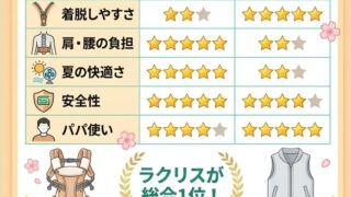 抱っこ紐選びで迷ったら「べべスワン」と「アップリカ ラクリス」の2択で比較!育児3年目パパ目線で着脱・腰への負担・デザイン・コスパを徹底比較。補欠のエルゴ情報も収録。