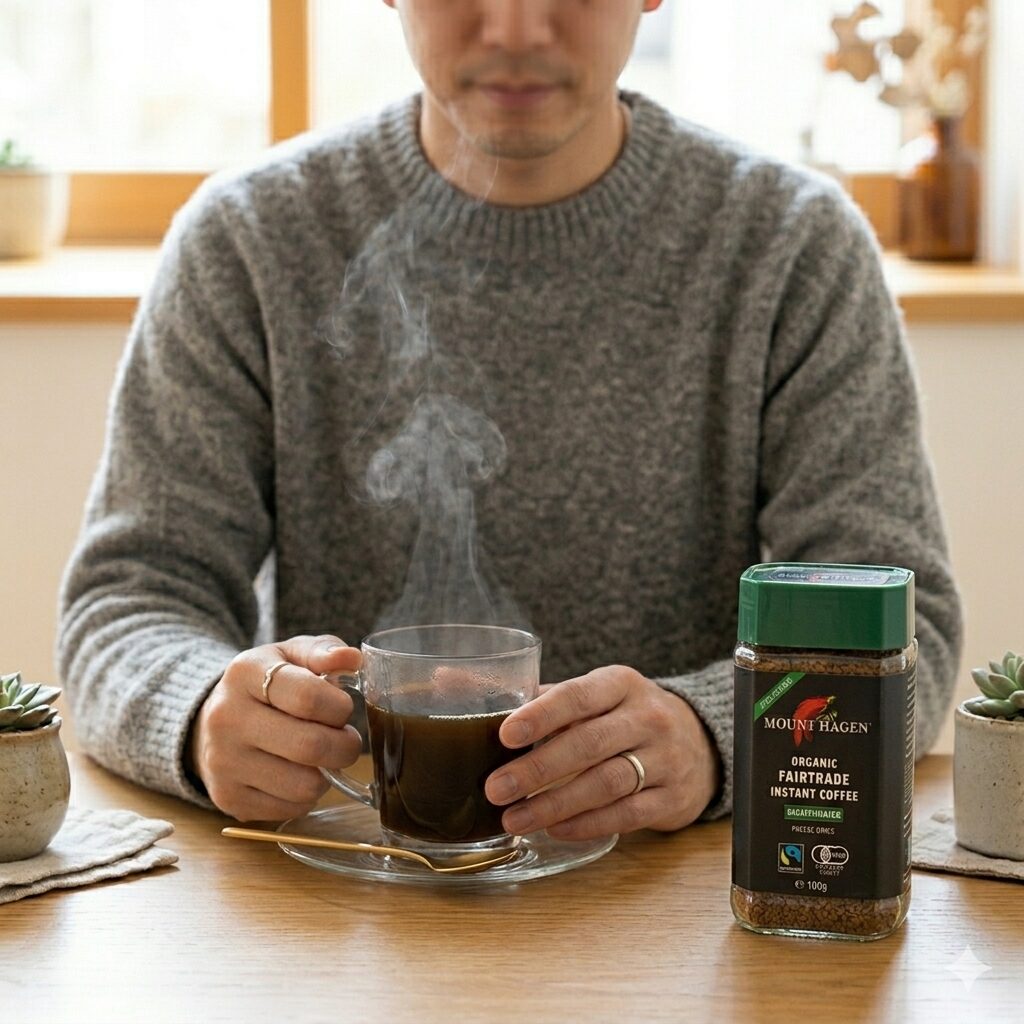 以前はカフェインのせいで夜コーヒーを飲むと眠れなくなっていました。マウントハーゲンに切り替えてから、夜21時に飲んでも睡眠の質が落ちなくなりました。これだけで生活の質がグッと上がった実感があります。
